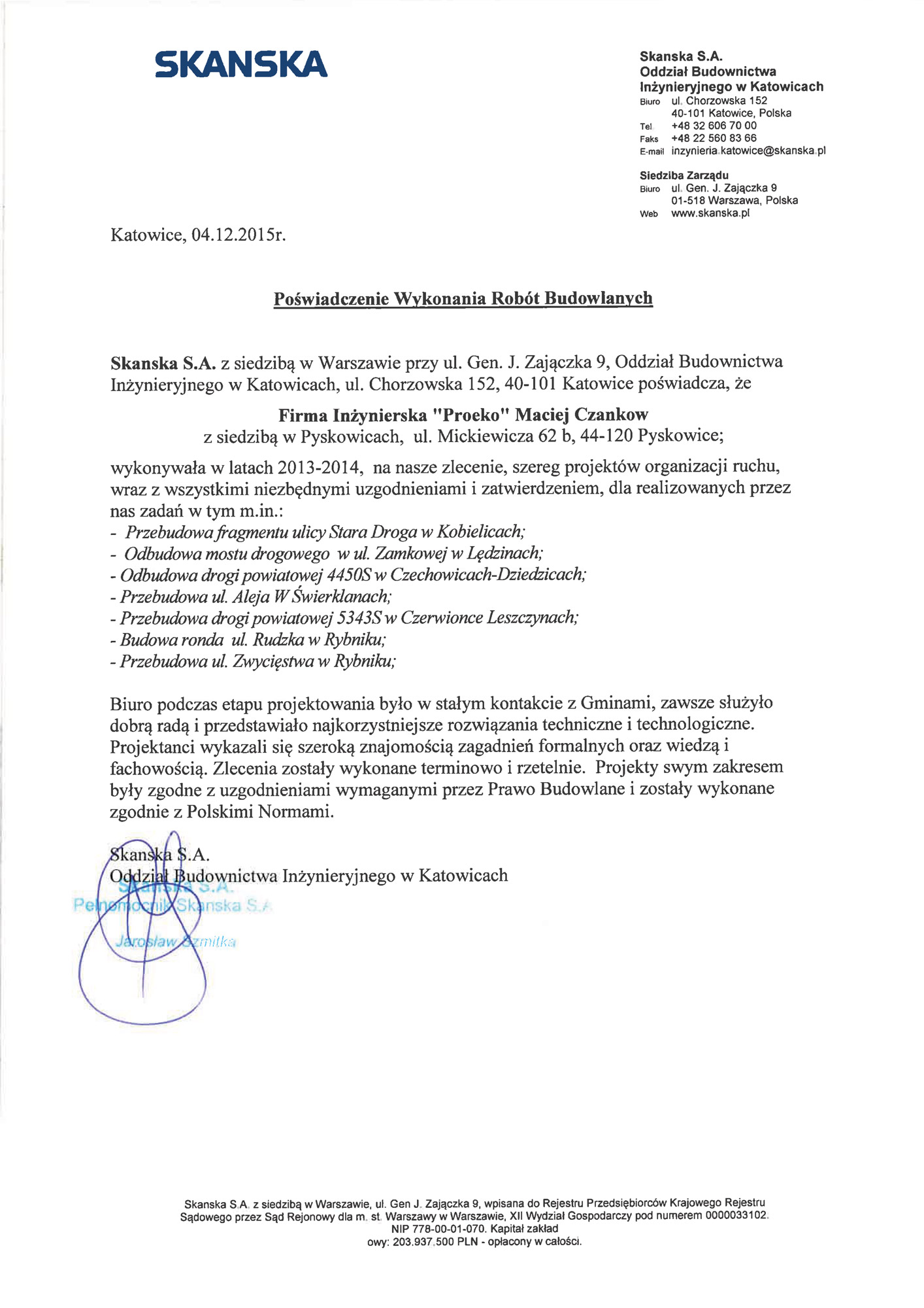 - Projekty organizacji ruchu + uzgodnienia dla Skanska S.A.